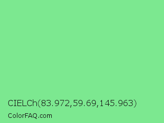 CIELCh 83.972,59.69,145.963 Color is a light green color and the nearest color is Light Green #90ee90. Hex code #7ce890 and RGB value is rgb(124,232,144). In RGB color space, this color is composed of 49% red, 91% green, 56% blue, In CMYK color space, this color is composed of 47% cyan, 0% magenta, 38% yellow , 9% black , In HSL color space, this color has a hue angle of 131° , 70% saturation and 70% lightness.