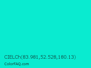 CIELCh 83.981,52.528,180.13 Color is a normal cyan color and the nearest color is Bright Turquoise #08e8de. Hex code #09ebd0 and RGB value is rgb(9,235,208). In RGB color space, this color is composed of 4% red, 92% green, 82% blue, In CMYK color space, this color is composed of 96% cyan, 0% magenta, 11% yellow , 8% black , In HSL color space, this color has a hue angle of 173° , 93% saturation and 48% lightness.