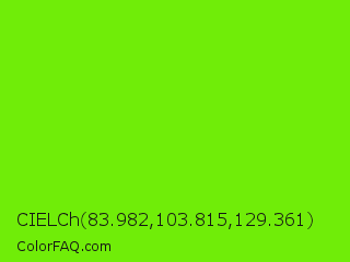 CIELCh 83.982,103.815,129.361 Color is a normal green color and the nearest color is Lawn Green #7cfc00. Hex code #70ed08 and RGB value is rgb(112,237,8). In RGB color space, this color is composed of 44% red, 93% green, 3% blue, In CMYK color space, this color is composed of 53% cyan, 0% magenta, 97% yellow , 7% black , In HSL color space, this color has a hue angle of 93° , 93% saturation and 48% lightness.