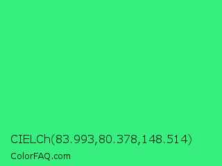 CIELCh 83.993,80.378,148.514 Color is a normal green color and the nearest color is UFO Green #3cd070. Hex code #37ef7e and RGB value is rgb(55,239,126). In RGB color space, this color is composed of 22% red, 94% green, 49% blue, In CMYK color space, this color is composed of 77% cyan, 0% magenta, 47% yellow , 6% black , In HSL color space, this color has a hue angle of 143° , 85% saturation and 58% lightness.