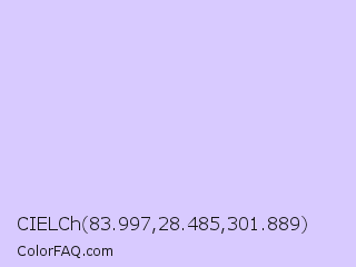 CIELCh 83.997,28.485,301.889 Color is a very light indigo color and the nearest color is Fog #d7d0ff. Hex code #d8caff and RGB value is rgb(216,202,255). In RGB color space, this color is composed of 85% red, 79% green, 100% blue, In CMYK color space, this color is composed of 15% cyan, 21% magenta, 0% yellow , 0% black , In HSL color space, this color has a hue angle of 256° , 100% saturation and 90% lightness.
