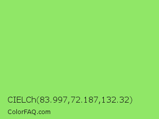 CIELCh 83.997,72.187,132.32 Color is a light green color and the nearest color is Pastel Green #77dd77. Hex code #90e767 and RGB value is rgb(144,231,103). In RGB color space, this color is composed of 56% red, 91% green, 40% blue, In CMYK color space, this color is composed of 38% cyan, 0% magenta, 55% yellow , 9% black , In HSL color space, this color has a hue angle of 101° , 73% saturation and 65% lightness.