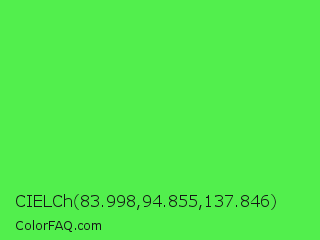 CIELCh 83.998,94.855,137.846 Color is a light green color and the nearest color is Screamin Green #66ff66. Hex code #52ef4d and RGB value is rgb(82,239,77). In RGB color space, this color is composed of 32% red, 94% green, 30% blue, In CMYK color space, this color is composed of 66% cyan, 0% magenta, 68% yellow , 6% black , In HSL color space, this color has a hue angle of 118° , 84% saturation and 62% lightness.