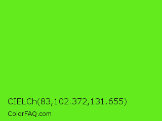 CIELCh 83,102.372,131.655 Color is a normal green color and the nearest color is Bright Green #66ff00. Hex code #63eb1e and RGB value is rgb(99,235,30). In RGB color space, this color is composed of 39% red, 92% green, 12% blue, In CMYK color space, this color is composed of 58% cyan, 0% magenta, 87% yellow , 8% black , In HSL color space, this color has a hue angle of 100° , 84% saturation and 52% lightness.