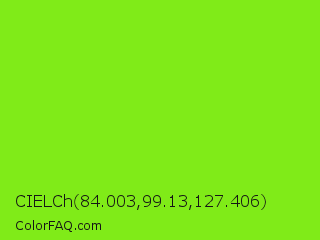 CIELCh 84.003,99.13,127.406 Color is a normal green color and the nearest color is Alien Armpit #84de02. Hex code #80eb18 and RGB value is rgb(128,235,24). In RGB color space, this color is composed of 50% red, 92% green, 9% blue, In CMYK color space, this color is composed of 46% cyan, 0% magenta, 90% yellow , 8% black , In HSL color space, this color has a hue angle of 90° , 84% saturation and 51% lightness.