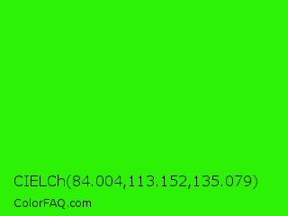 CIELCh 84.004,113.152,135.079 Color is a normal green color and the nearest color is Harlequin #3fff00. Hex code #2df205 and RGB value is rgb(45,242,5). In RGB color space, this color is composed of 18% red, 95% green, 2% blue, In CMYK color space, this color is composed of 81% cyan, 0% magenta, 98% yellow , 5% black , In HSL color space, this color has a hue angle of 110° , 96% saturation and 48% lightness.