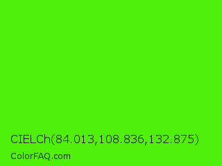 CIELCh 84.013,108.836,132.875 Color is a normal green color and the nearest color is Chlorophyll Green #4aff00. Hex code #51f00a and RGB value is rgb(81,240,10). In RGB color space, this color is composed of 32% red, 94% green, 4% blue, In CMYK color space, this color is composed of 66% cyan, 0% magenta, 96% yellow , 6% black , In HSL color space, this color has a hue angle of 101° , 92% saturation and 49% lightness.