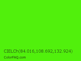 CIELCh 84.016,108.692,132.924 Color is a normal green color and the nearest color is Chlorophyll Green #4aff00. Hex code #51f00c and RGB value is rgb(81,240,12). In RGB color space, this color is composed of 32% red, 94% green, 5% blue, In CMYK color space, this color is composed of 66% cyan, 0% magenta, 95% yellow , 6% black , In HSL color space, this color has a hue angle of 102° , 90% saturation and 49% lightness.