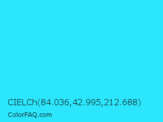 CIELCh 84.036,42.995,212.688 Color is a normal cyan color and the nearest color is Loeen #15f2fd. Hex code #2be6fc and RGB value is rgb(43,230,252). In RGB color space, this color is composed of 17% red, 90% green, 99% blue, In CMYK color space, this color is composed of 83% cyan, 9% magenta, 0% yellow , 1% black , In HSL color space, this color has a hue angle of 186° , 97% saturation and 58% lightness.