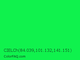 CIELCh 84.039,101.132,141.151 Color is a normal green color and the nearest color is Malachite #0bda51. Hex code #0ff24d and RGB value is rgb(15,242,77). In RGB color space, this color is composed of 6% red, 95% green, 30% blue, In CMYK color space, this color is composed of 94% cyan, 0% magenta, 68% yellow , 5% black , In HSL color space, this color has a hue angle of 136° , 90% saturation and 50% lightness.
