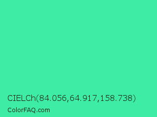 CIELCh 84.056,64.917,158.738 Color is a normal green color and the nearest color is Eucalyptus #44d7a8. Hex code #3ceda3 and RGB value is rgb(60,237,163). In RGB color space, this color is composed of 24% red, 93% green, 64% blue, In CMYK color space, this color is composed of 75% cyan, 0% magenta, 31% yellow , 7% black , In HSL color space, this color has a hue angle of 155° , 83% saturation and 58% lightness.