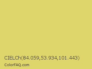 CIELCh 84.059,53.934,101.443 Color is a light yellow color and the nearest color is Straw #e4d96f. Hex code #ded56b and RGB value is rgb(222,213,107). In RGB color space, this color is composed of 87% red, 84% green, 42% blue, In CMYK color space, this color is composed of 0% cyan, 4% magenta, 52% yellow , 13% black , In HSL color space, this color has a hue angle of 55° , 64% saturation and 65% lightness.