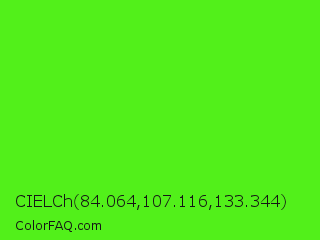 CIELCh 84.064,107.116,133.344 Color is a normal green color and the nearest color is Neon Green #39ff14. Hex code #52f01a and RGB value is rgb(82,240,26). In RGB color space, this color is composed of 32% red, 94% green, 10% blue, In CMYK color space, this color is composed of 66% cyan, 0% magenta, 89% yellow , 6% black , In HSL color space, this color has a hue angle of 104° , 88% saturation and 52% lightness.