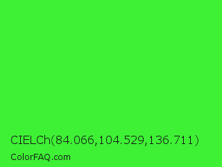 CIELCh 84.066,104.529,136.711 Color is a normal green color and the nearest color is Neon Green #39ff14. Hex code #3ef135 and RGB value is rgb(62,241,53). In RGB color space, this color is composed of 24% red, 95% green, 21% blue, In CMYK color space, this color is composed of 74% cyan, 0% magenta, 78% yellow , 5% black , In HSL color space, this color has a hue angle of 117° , 87% saturation and 58% lightness.