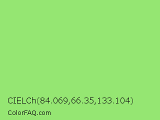 CIELCh 84.069,66.35,133.104 Color is a light green color and the nearest color is Feijoa #9fdd8c. Hex code #95e672 and RGB value is rgb(149,230,114). In RGB color space, this color is composed of 58% red, 90% green, 45% blue, In CMYK color space, this color is composed of 35% cyan, 0% magenta, 50% yellow , 10% black , In HSL color space, this color has a hue angle of 102° , 70% saturation and 67% lightness.