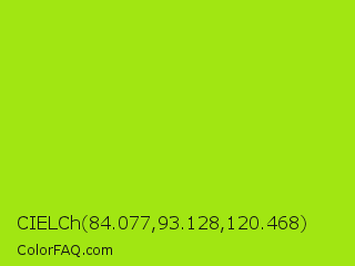 CIELCh 84.077,93.128,120.468 Color is a normal green color and the nearest color is Inch Worm #b0e313. Hex code #a1e612 and RGB value is rgb(161,230,18). In RGB color space, this color is composed of 63% red, 90% green, 7% blue, In CMYK color space, this color is composed of 30% cyan, 0% magenta, 92% yellow , 10% black , In HSL color space, this color has a hue angle of 80° , 85% saturation and 49% lightness.