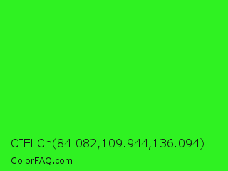 CIELCh 84.082,109.944,136.094 Color is a normal green color and the nearest color is Neon Green #39ff14. Hex code #2ff222 and RGB value is rgb(47,242,34). In RGB color space, this color is composed of 18% red, 95% green, 13% blue, In CMYK color space, this color is composed of 81% cyan, 0% magenta, 86% yellow , 5% black , In HSL color space, this color has a hue angle of 116° , 89% saturation and 54% lightness.