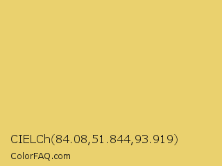 CIELCh 84.08,51.844,93.919 Color is a light yellow color and the nearest color is Hansa Yellow #e9d66b. Hex code #ead16e and RGB value is rgb(234,209,110). In RGB color space, this color is composed of 92% red, 82% green, 43% blue, In CMYK color space, this color is composed of 0% cyan, 11% magenta, 53% yellow , 8% black , In HSL color space, this color has a hue angle of 48° , 75% saturation and 67% lightness.