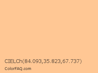 CIELCh 84.093,35.823,67.737 Color is a light orange color and the nearest color is Peach Orange #ffcc99. Hex code #ffc794 and RGB value is rgb(255,199,148). In RGB color space, this color is composed of 100% red, 78% green, 58% blue, In CMYK color space, this color is composed of 0% cyan, 22% magenta, 42% yellow , 0% black , In HSL color space, this color has a hue angle of 29° , 100% saturation and 79% lightness.