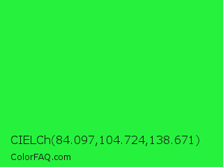 CIELCh 84.097,104.724,138.671 Color is a normal green color and the nearest color is Lime Green #32cd32. Hex code #26f23d and RGB value is rgb(38,242,61). In RGB color space, this color is composed of 15% red, 95% green, 24% blue, In CMYK color space, this color is composed of 84% cyan, 0% magenta, 75% yellow , 5% black , In HSL color space, this color has a hue angle of 127° , 89% saturation and 55% lightness.