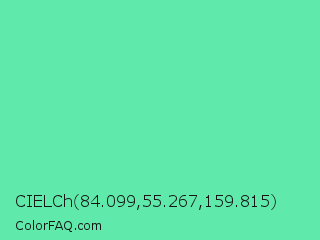CIELCh 84.099,55.267,159.815 Color is a light green color and the nearest color is Medium Aquamarine #66ddaa. Hex code #5feaac and RGB value is rgb(95,234,172). In RGB color space, this color is composed of 37% red, 92% green, 67% blue, In CMYK color space, this color is composed of 59% cyan, 0% magenta, 26% yellow , 8% black , In HSL color space, this color has a hue angle of 153° , 77% saturation and 65% lightness.