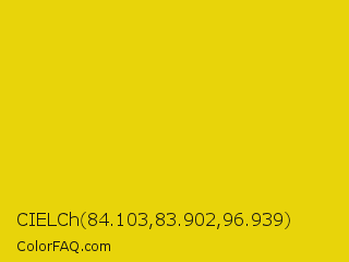 CIELCh 84.103,83.902,96.939 Color is a normal yellow color and the nearest color is Citrine #e4d00a. Hex code #e8d40a and RGB value is rgb(232,212,10). In RGB color space, this color is composed of 91% red, 83% green, 4% blue, In CMYK color space, this color is composed of 0% cyan, 9% magenta, 96% yellow , 9% black , In HSL color space, this color has a hue angle of 55° , 92% saturation and 47% lightness.