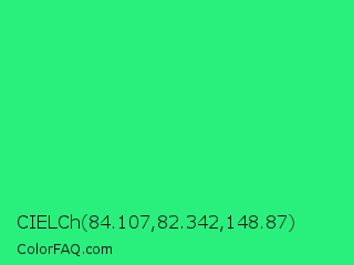 CIELCh 84.107,82.342,148.87 Color is a normal green color and the nearest color is UFO Green #3cd070. Hex code #29f07d and RGB value is rgb(41,240,125). In RGB color space, this color is composed of 16% red, 94% green, 49% blue, In CMYK color space, this color is composed of 83% cyan, 0% magenta, 48% yellow , 6% black , In HSL color space, this color has a hue angle of 145° , 87% saturation and 55% lightness.