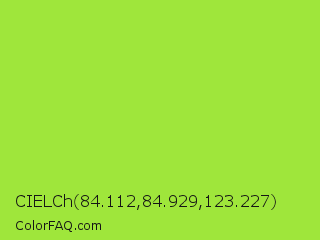 CIELCh 84.112,84.929,123.227 Color is a normal green color and the nearest color is Kiwi #8ee53f. Hex code #9fe63b and RGB value is rgb(159,230,59). In RGB color space, this color is composed of 62% red, 90% green, 23% blue, In CMYK color space, this color is composed of 31% cyan, 0% magenta, 74% yellow , 10% black , In HSL color space, this color has a hue angle of 85° , 77% saturation and 57% lightness.