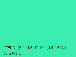 CIELCh 84.118,62.611,161.869 Color is a normal green color and the nearest color is Eucalyptus #44d7a8. Hex code #36edab and RGB value is rgb(54,237,171). In RGB color space, this color is composed of 21% red, 93% green, 67% blue, In CMYK color space, this color is composed of 77% cyan, 0% magenta, 28% yellow , 7% black , In HSL color space, this color has a hue angle of 158° , 84% saturation and 57% lightness.