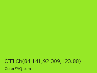 CIELCh 84.141,92.309,123.88 Color is a normal green color and the nearest color is Green Lizard #a7f432. Hex code #96e826 and RGB value is rgb(150,232,38). In RGB color space, this color is composed of 59% red, 91% green, 15% blue, In CMYK color space, this color is composed of 35% cyan, 0% magenta, 84% yellow , 9% black , In HSL color space, this color has a hue angle of 85° , 81% saturation and 53% lightness.