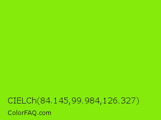 CIELCh 84.145,99.984,126.327 Color is a normal green color and the nearest color is Alien Armpit #84de02. Hex code #84eb0a and RGB value is rgb(132,235,10). In RGB color space, this color is composed of 52% red, 92% green, 4% blue, In CMYK color space, this color is composed of 44% cyan, 0% magenta, 96% yellow , 8% black , In HSL color space, this color has a hue angle of 87° , 92% saturation and 48% lightness.