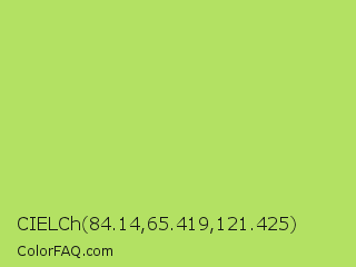 CIELCh 84.14,65.419,121.425 Color is a light green color and the nearest color is Inchworm #b2ec5d. Hex code #b3e163 and RGB value is rgb(179,225,99). In RGB color space, this color is composed of 70% red, 88% green, 39% blue, In CMYK color space, this color is composed of 20% cyan, 0% magenta, 56% yellow , 12% black , In HSL color space, this color has a hue angle of 82° , 68% saturation and 64% lightness.