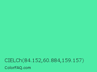 CIELCh 84.152,60.884,159.157 Color is a light green color and the nearest color is Eucalyptus #44d7a8. Hex code #4deca7 and RGB value is rgb(77,236,167). In RGB color space, this color is composed of 30% red, 93% green, 65% blue, In CMYK color space, this color is composed of 67% cyan, 0% magenta, 29% yellow , 7% black , In HSL color space, this color has a hue angle of 154° , 81% saturation and 61% lightness.