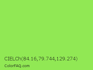 CIELCh 84.16,79.744,129.274 Color is a light green color and the nearest color is Kiwi #8ee53f. Hex code #91e854 and RGB value is rgb(145,232,84). In RGB color space, this color is composed of 57% red, 91% green, 33% blue, In CMYK color space, this color is composed of 38% cyan, 0% magenta, 64% yellow , 9% black , In HSL color space, this color has a hue angle of 95° , 76% saturation and 62% lightness.