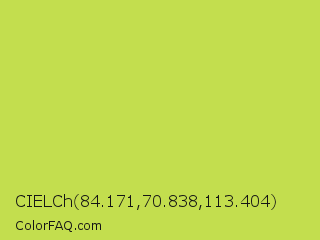CIELCh 84.171,70.838,113.404 Color is a normal lime color and the nearest color is June Bud #bdda57. Hex code #c3de4e and RGB value is rgb(195,222,78). In RGB color space, this color is composed of 76% red, 87% green, 31% blue, In CMYK color space, this color is composed of 12% cyan, 0% magenta, 65% yellow , 13% black , In HSL color space, this color has a hue angle of 71° , 69% saturation and 59% lightness.