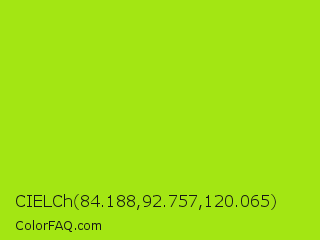 CIELCh 84.188,92.757,120.065 Color is a normal lime color and the nearest color is Inch Worm #b0e313. Hex code #a3e613 and RGB value is rgb(163,230,19). In RGB color space, this color is composed of 64% red, 90% green, 7% blue, In CMYK color space, this color is composed of 29% cyan, 0% magenta, 92% yellow , 10% black , In HSL color space, this color has a hue angle of 79° , 85% saturation and 49% lightness.