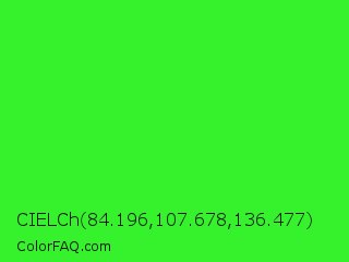 CIELCh 84.196,107.678,136.477 Color is a normal green color and the nearest color is Neon Green #39ff14. Hex code #35f22c and RGB value is rgb(53,242,44). In RGB color space, this color is composed of 21% red, 95% green, 17% blue, In CMYK color space, this color is composed of 78% cyan, 0% magenta, 82% yellow , 5% black , In HSL color space, this color has a hue angle of 117° , 88% saturation and 56% lightness.