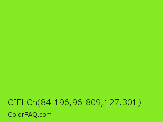 CIELCh 84.196,96.809,127.301 Color is a normal green color and the nearest color is Spring Frost #87ff2a. Hex code #84eb23 and RGB value is rgb(132,235,35). In RGB color space, this color is composed of 52% red, 92% green, 14% blue, In CMYK color space, this color is composed of 44% cyan, 0% magenta, 85% yellow , 8% black , In HSL color space, this color has a hue angle of 91° , 83% saturation and 53% lightness.