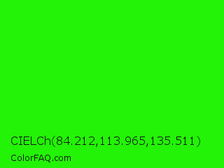CIELCh 84.212,113.965,135.511 Color is a normal green color and the nearest color is Neon Green #39ff14. Hex code #23f307 and RGB value is rgb(35,243,7). In RGB color space, this color is composed of 14% red, 95% green, 3% blue, In CMYK color space, this color is composed of 86% cyan, 0% magenta, 97% yellow , 5% black , In HSL color space, this color has a hue angle of 113° , 94% saturation and 49% lightness.