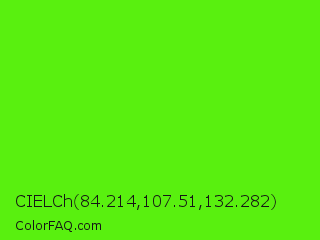 CIELCh 84.214,107.51,132.282 Color is a normal green color and the nearest color is Bright Green #66ff00. Hex code #59f00f and RGB value is rgb(89,240,15). In RGB color space, this color is composed of 35% red, 94% green, 6% blue, In CMYK color space, this color is composed of 63% cyan, 0% magenta, 94% yellow , 6% black , In HSL color space, this color has a hue angle of 100° , 88% saturation and 50% lightness.