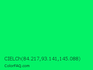 CIELCh 84.217,93.141,145.088 Color is a normal green color and the nearest color is Spring Green #00ff7f. Hex code #03f266 and RGB value is rgb(3,242,102). In RGB color space, this color is composed of 1% red, 95% green, 40% blue, In CMYK color space, this color is composed of 99% cyan, 0% magenta, 58% yellow , 5% black , In HSL color space, this color has a hue angle of 145° , 98% saturation and 48% lightness.