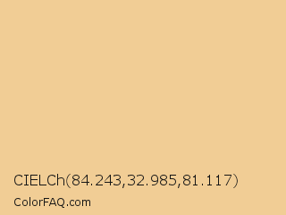 CIELCh 84.243,32.985,81.117 Color is a light orange color and the nearest color is Manhattan #f5c999. Hex code #f1cd95 and RGB value is rgb(241,205,149). In RGB color space, this color is composed of 95% red, 80% green, 58% blue, In CMYK color space, this color is composed of 0% cyan, 15% magenta, 38% yellow , 5% black , In HSL color space, this color has a hue angle of 37° , 77% saturation and 76% lightness.