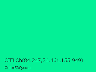 CIELCh 84.247,74.461,155.949 Color is a normal green color and the nearest color is Medium Spring Green #00fa9a. Hex code #03f096 and RGB value is rgb(3,240,150). In RGB color space, this color is composed of 1% red, 94% green, 59% blue, In CMYK color space, this color is composed of 99% cyan, 0% magenta, 38% yellow , 6% black , In HSL color space, this color has a hue angle of 157° , 98% saturation and 48% lightness.