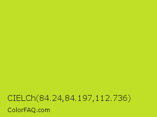 CIELCh 84.24,84.197,112.736 Color is a normal lime color and the nearest color is Pear #d1e231. Hex code #bfe026 and RGB value is rgb(191,224,38). In RGB color space, this color is composed of 75% red, 88% green, 15% blue, In CMYK color space, this color is composed of 15% cyan, 0% magenta, 83% yellow , 12% black , In HSL color space, this color has a hue angle of 71° , 75% saturation and 51% lightness.