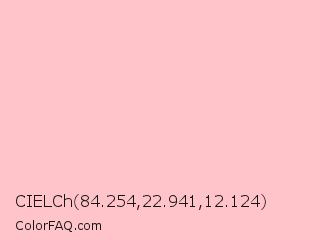 CIELCh 84.254,22.941,12.124 Color is a very light red color and the nearest color is Bubble Gum #ffc1cc. Hex code #ffc3ca and RGB value is rgb(255,195,202). In RGB color space, this color is composed of 100% red, 76% green, 79% blue, In CMYK color space, this color is composed of 0% cyan, 24% magenta, 21% yellow , 0% black , In HSL color space, this color has a hue angle of 353° , 100% saturation and 88% lightness.