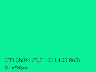 CIELCh 84.27,74.304,155.865 Color is a normal green color and the nearest color is Medium Spring Green #00fa9a. Hex code #0af096 and RGB value is rgb(10,240,150). In RGB color space, this color is composed of 4% red, 94% green, 59% blue, In CMYK color space, this color is composed of 96% cyan, 0% magenta, 38% yellow , 6% black , In HSL color space, this color has a hue angle of 157° , 92% saturation and 49% lightness.