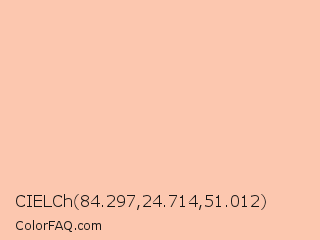 CIELCh 84.297,24.714,51.012 Color is a very light orange color and the nearest color is Apricot Peach #fbceb1. Hex code #fcc7af and RGB value is rgb(252,199,175). In RGB color space, this color is composed of 99% red, 78% green, 69% blue, In CMYK color space, this color is composed of 0% cyan, 21% magenta, 31% yellow , 1% black , In HSL color space, this color has a hue angle of 19° , 93% saturation and 84% lightness.