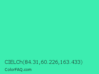 CIELCh 84.31,60.226,163.433 Color is a normal green color and the nearest color is Eucalyptus #44d7a8. Hex code #3cedb0 and RGB value is rgb(60,237,176). In RGB color space, this color is composed of 24% red, 93% green, 69% blue, In CMYK color space, this color is composed of 75% cyan, 0% magenta, 26% yellow , 7% black , In HSL color space, this color has a hue angle of 159° , 83% saturation and 58% lightness.