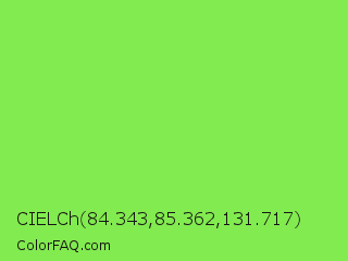 CIELCh 84.343,85.362,131.717 Color is a light green color and the nearest color is Kiwi #8ee53f. Hex code #82eb4f and RGB value is rgb(130,235,79). In RGB color space, this color is composed of 51% red, 92% green, 31% blue, In CMYK color space, this color is composed of 45% cyan, 0% magenta, 66% yellow , 8% black , In HSL color space, this color has a hue angle of 100° , 80% saturation and 62% lightness.