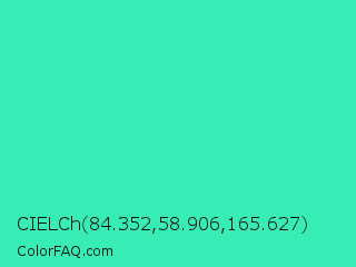CIELCh 84.352,58.906,165.627 Color is a normal green color and the nearest color is Eucalyptus #44d7a8. Hex code #38edb5 and RGB value is rgb(56,237,181). In RGB color space, this color is composed of 22% red, 93% green, 71% blue, In CMYK color space, this color is composed of 76% cyan, 0% magenta, 24% yellow , 7% black , In HSL color space, this color has a hue angle of 161° , 83% saturation and 57% lightness.